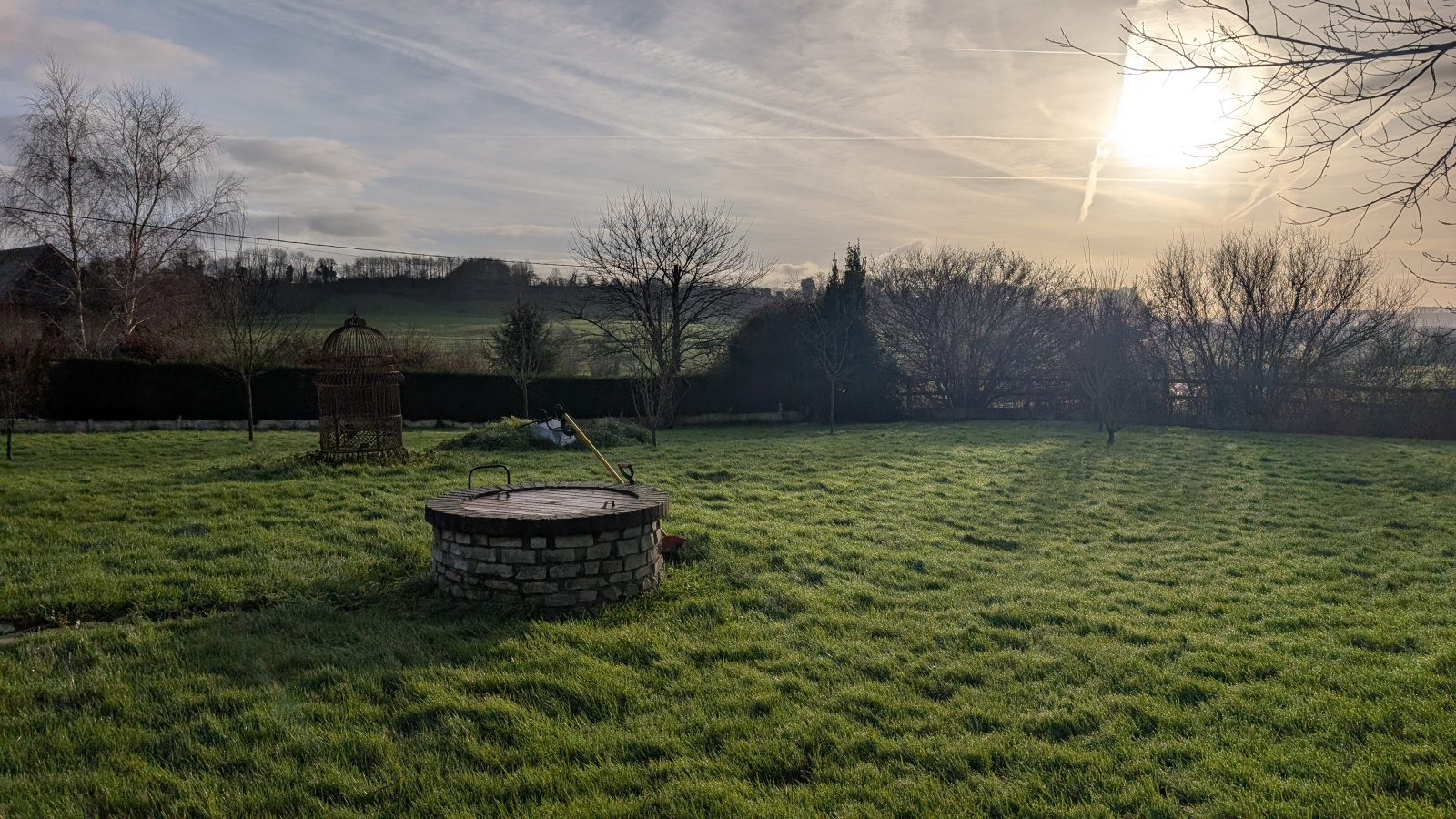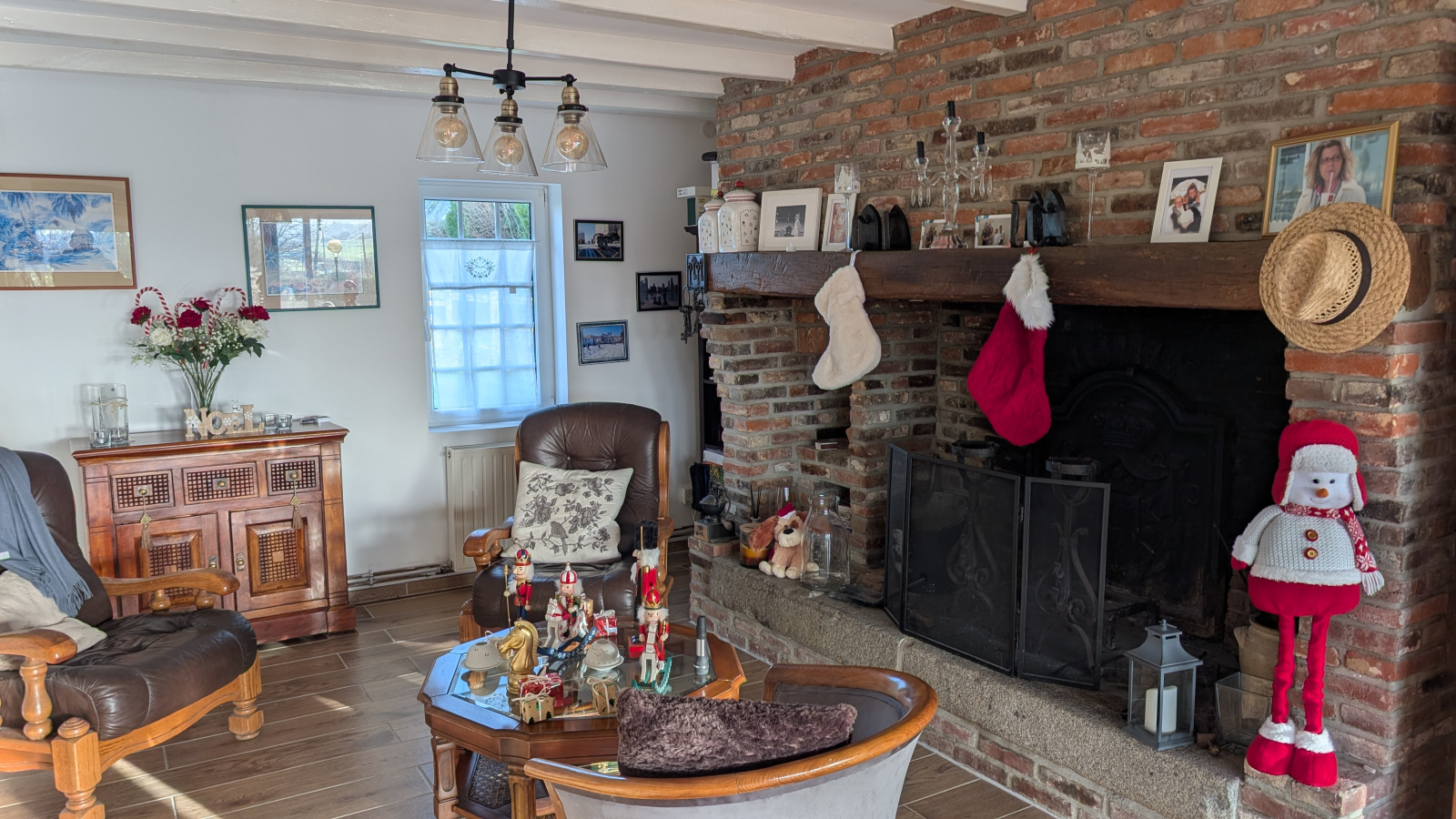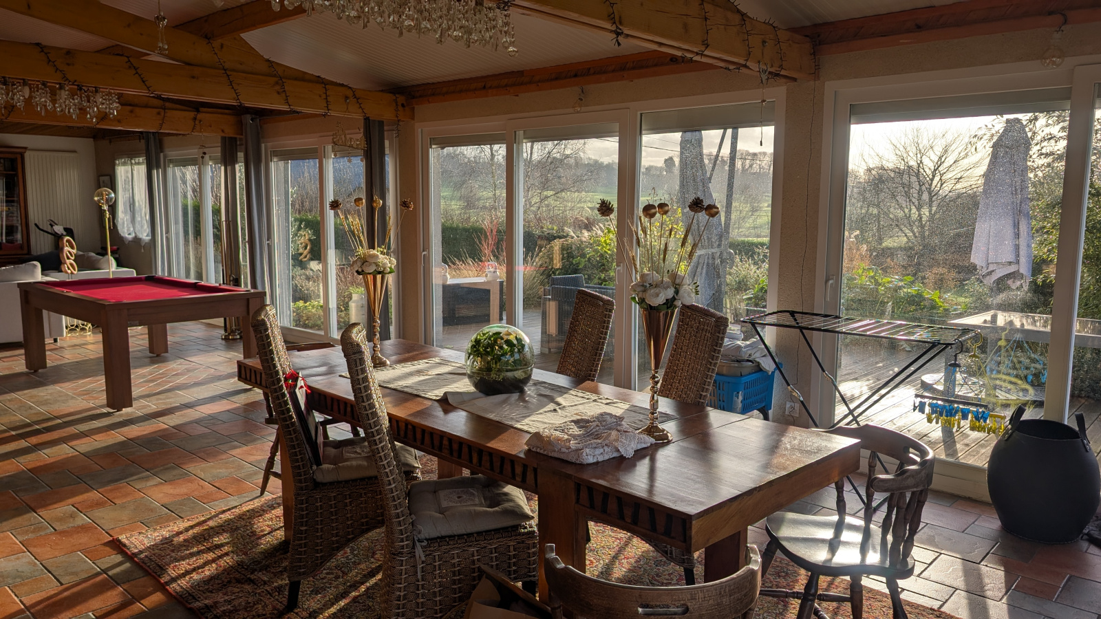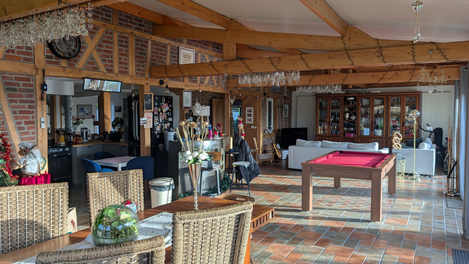 Entrée, wc, cellier, magnifique séjour d'environ 85 m² avec une vue dégagée sur la campagne, salle d'eau, une chambre.